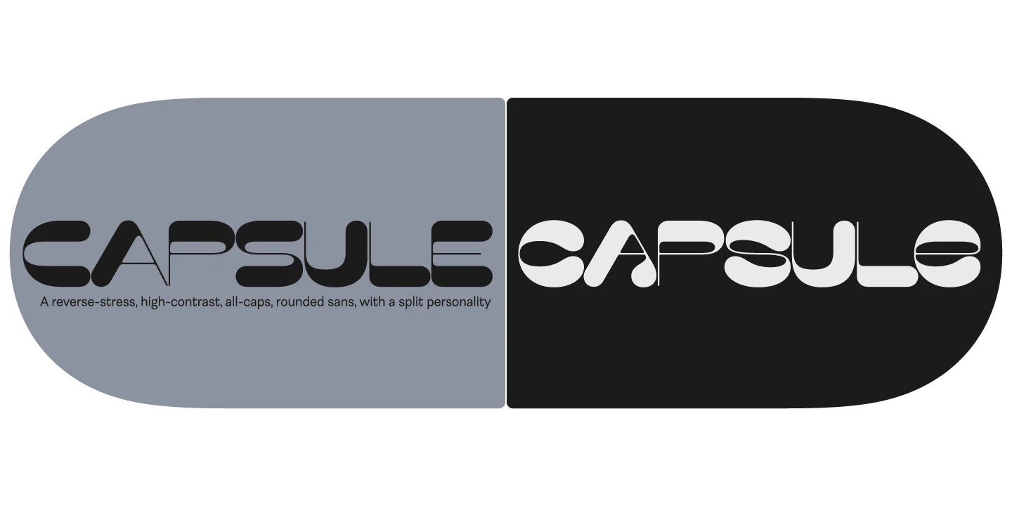 Capsule is a reverse-stress, high-contrast, rounded sans-serif font with two distinct personalities. An all-caps face with more playful variations of some letters in the lowercase slots with bulbous elements that riff on Phototype faces like Amelia and Data 70. But uppercase and lowercase all mix and match! Capsule should be set large. The fit is tight, and the kerning is aggressive. You’ll want to use it for impactful headlines, cutting-edge logos, and post-modern layouts.
