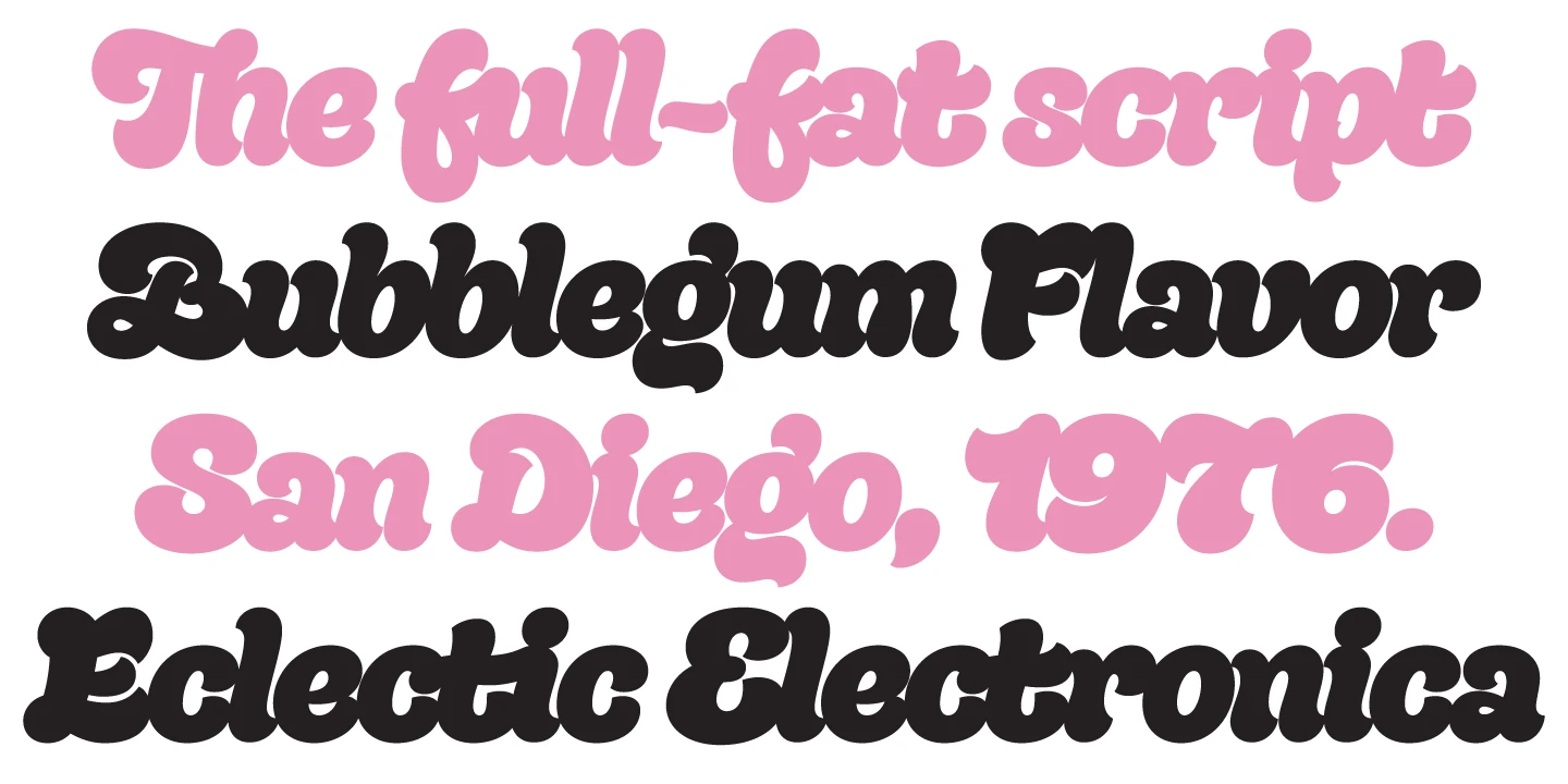 This is Quinella, plumper than a misguided Z-lister’s dodgy lip job. Named after those cheffy scoops of ice cream, quenelles. It’s a cute, voluptuous script with a seventies vibe and a personality all its own. It’s non-connecting in the usual sense, but the letters overlap to make the white space as tiny as possible. The full-fat, creamy appearance makes it perfect for food packaging, but don’t let it end there; it’ll make memorable logos, unmissable headlines, and posters with more punch.