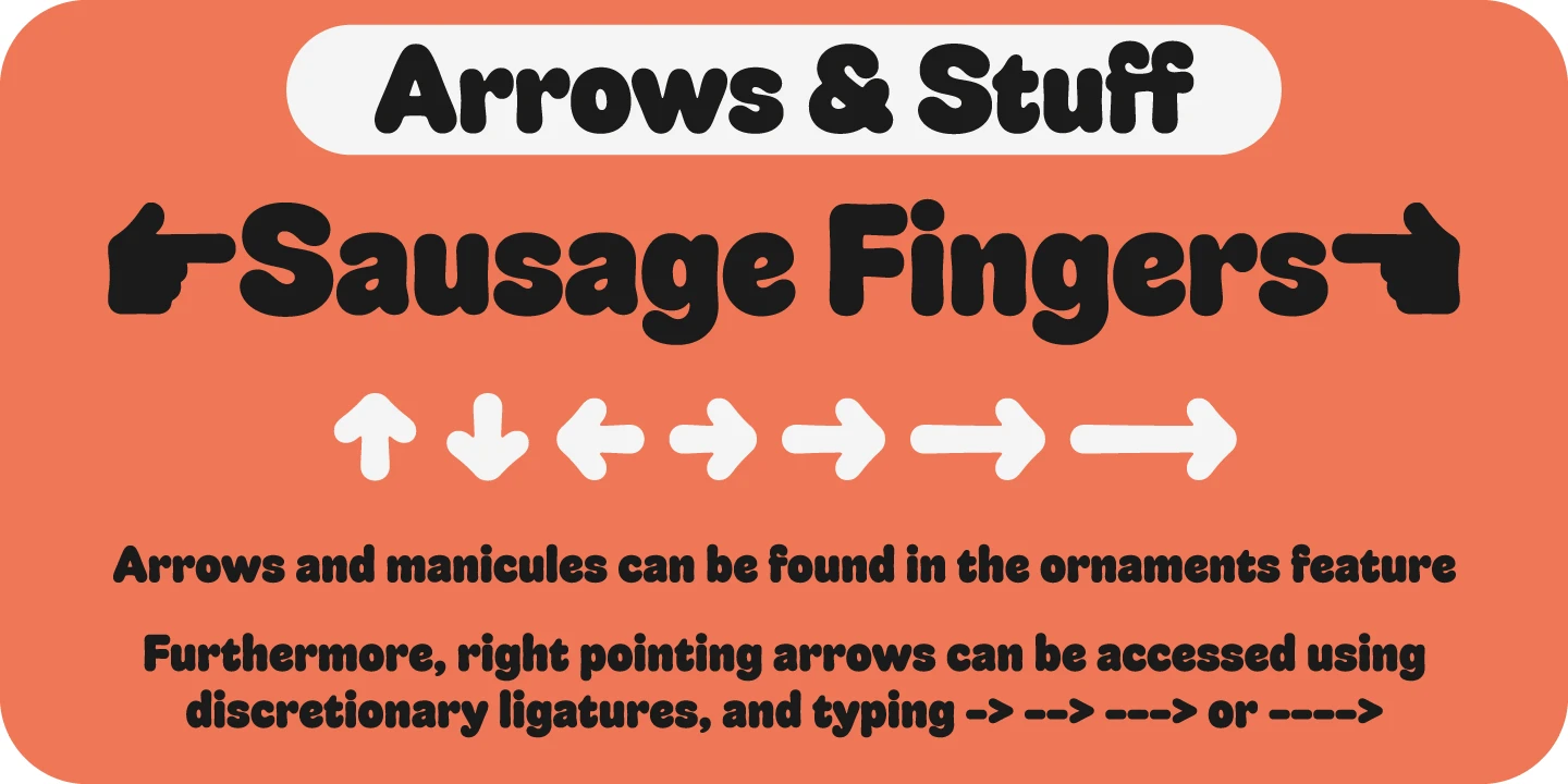 Sausage is unapologetically bold and bulbous. Influenced by magnetic fridge letters, hot dogs, and 70s phototype fonts. There isn’t a single corner in the entire font, and you’d be hard-pushed to find a straight line. This is as soft and friendly as it comes, and it is still equipped with numerous ligatures, alternates, and arrows for sophisticated typography. This seriously playful design is perfect for food and packaging, event branding, media and entertainment, merchandise, and books.
