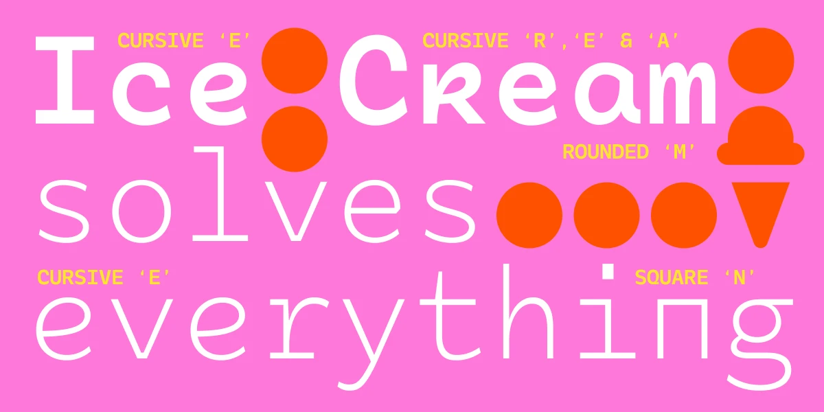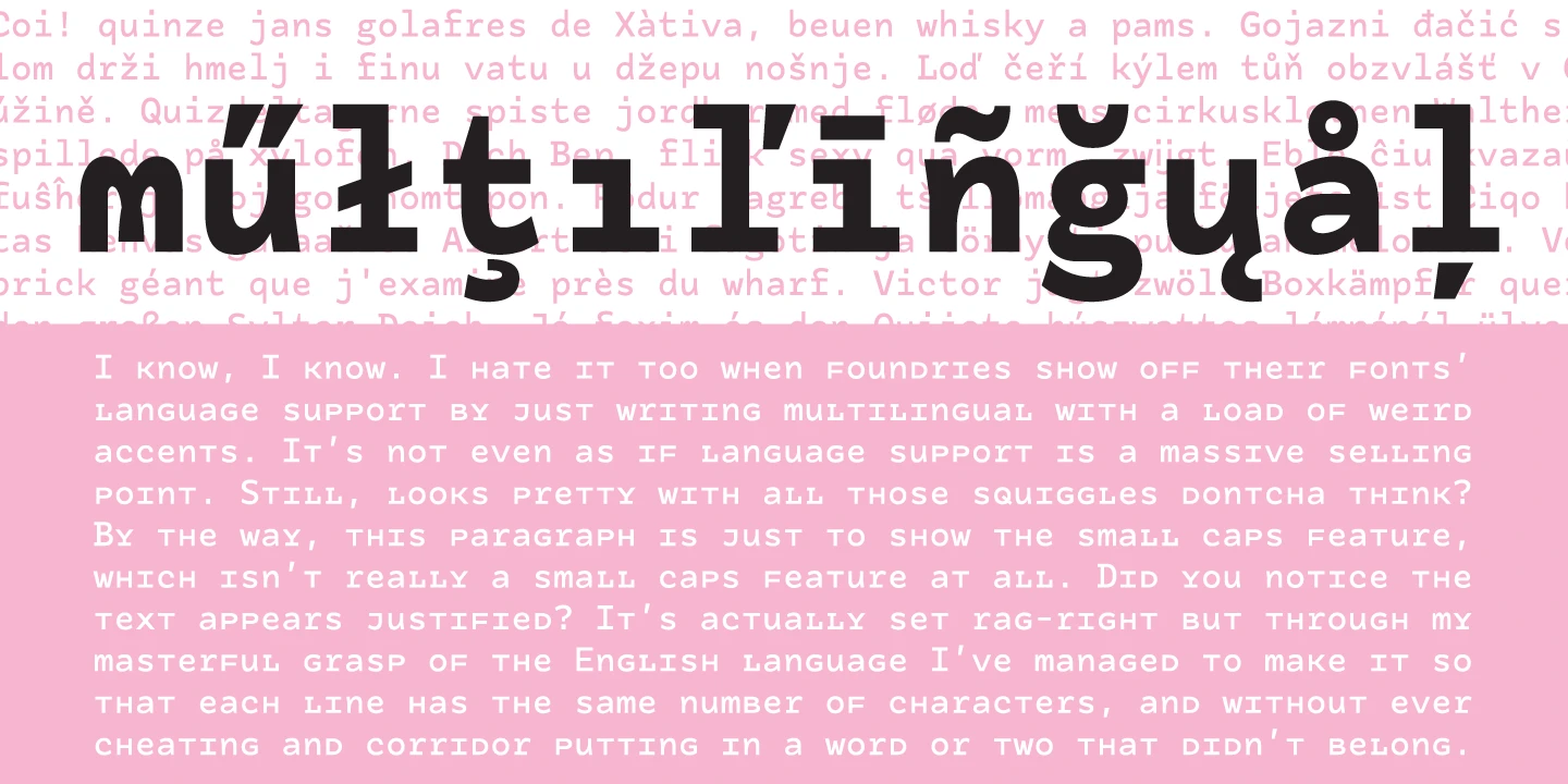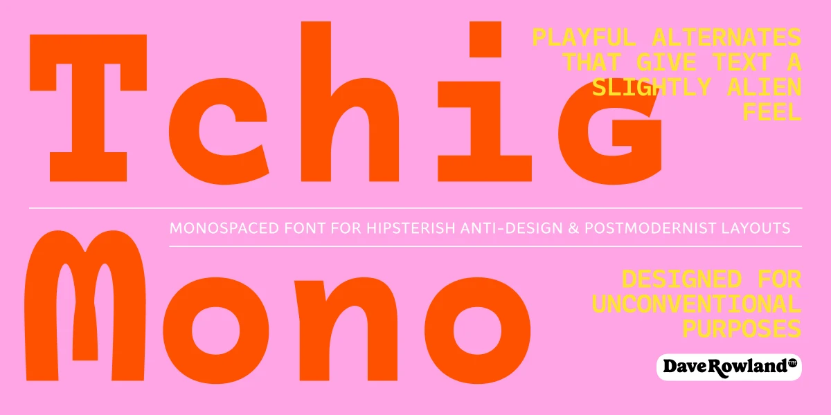 This is Tchig Mono, a monospaced font family not taking itself too seriously. It has a playful spirit with a few surprises. Stylistic sets offer cropped lowercase forms with a small-caps-like feel, plus a selection of alternates giving the text a slightly alien feel. Useful for coding and technical information? Sure! However, the more unorthodox shapes have a quirky vibe appropriate for postmodernist layouts, independent films, pop-up restaurants, and other out-of-the-box designs.